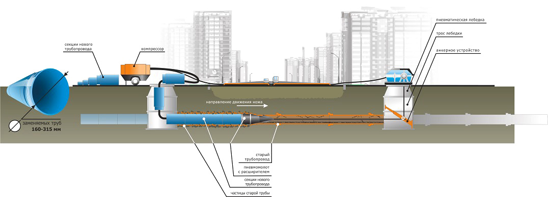 Для этого через демонтируемую трубу протягивается трос, который соединяется с разрушающей головкой. На ней закрепляется полиэтиленовая труба нужного диаметра. Затем под давлением, которое может достигать 30 тонн и более, трос протягивается внутри старой трубы, разрушая её и вдавливая в грунт. Одновременно с этим в образовавшийся канал прокладывается новый трубопровод.